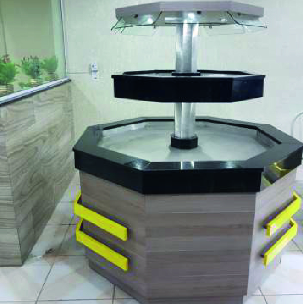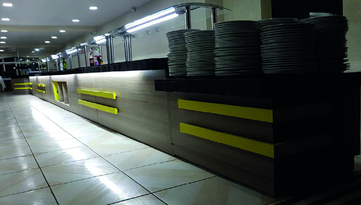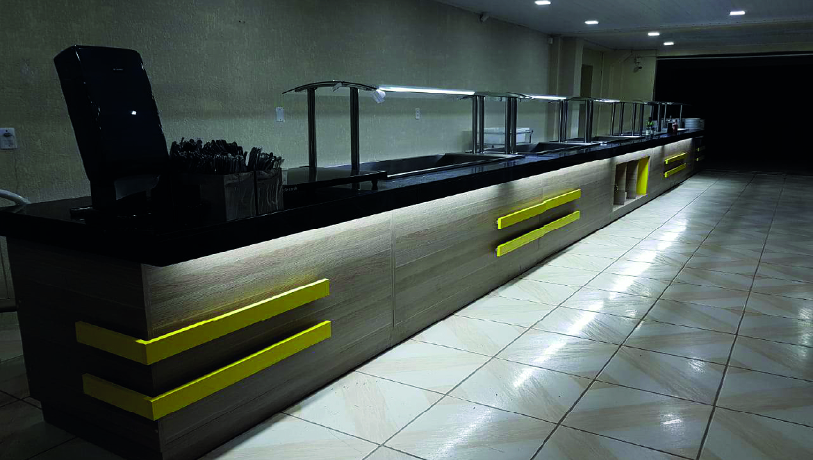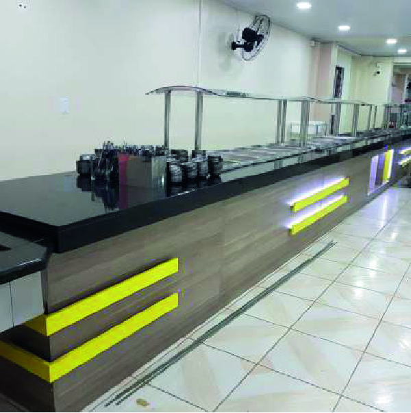 Projeto completo para aplicação em restaurante. Ilha completa para buffet, composta por ilha para pratos e talheres, cubas aquecidas para alimentos quentes, além de ilha resfriada para saladas e sobremesas.